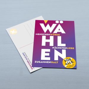 Das grafische Material zur Kampagne für die Bundestagswahl 2025 wurde von Carolin Horbank erstellt. Für Anpassungen kann man sich erneut an sie wenden. Alternativ stellen wir Ihnen in einem geschützten Bereich Grafikdateien zur Verfügung, die Sie selbst anpassen können. Bei Interesse senden Sie bitte eine E-Mail an kirche@evlks.de.