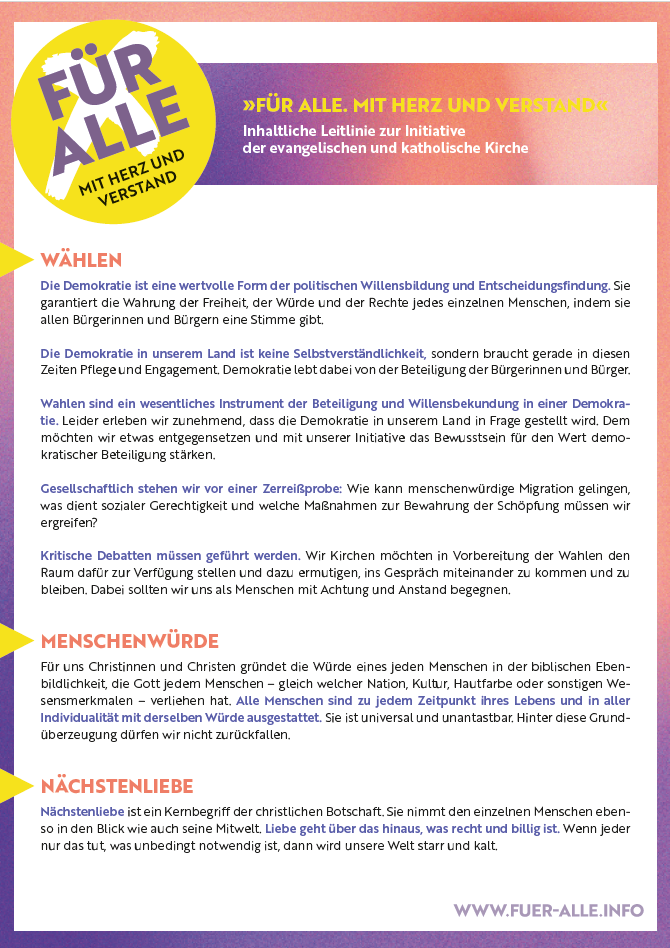 Der zentrale Claim der Initiative bindet alles zusammen. Für alle bedeutet: Menschenwürde, Nächstenliebe, Zusammenhalt kennen keine Ausnahme. Im Zusammenklang dieser drei Grundbegriffe können wir unser Gewissen schärfen. So lassen sich gewissenhaft Wahlentscheidungen treffen.